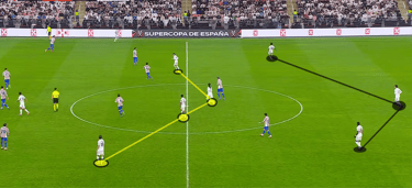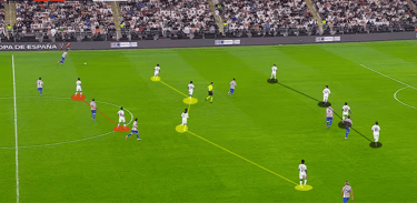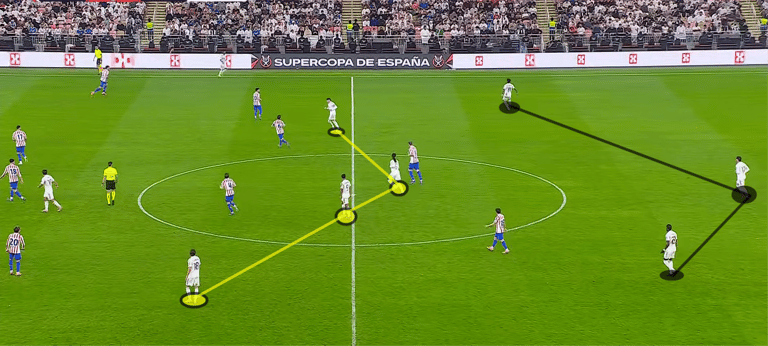 Στη φάση ανάπτυξης, η Ρεάλ απέφυγε το build-up από πίσω με τον Κουρτουά και επέλεξε συχνά τις μακρινές μπαλιές προς τον Μπέλινγχαμ, ο οποίος ήταν πανταχού παρών. Ο Άγγλος μέσος κατέγραψε 6 επανακτήσεις κατοχής και 8 μονομαχίες εδάφους (5 κερδισμένες). Όταν η Ρεάλ αναγκαζόταν να αναπτυχθεί πιο ορθολογικά, το σύστημα μετατρεπόταν σε 3-4-3, με ένα αμυντικό χαφ να οπισθοχωρεί ως τρίτος στόπερ και τα μπακ να ανεβαίνουν ψηλά, εκμεταλλευόμενα τους διαθέσιμους χώρους.