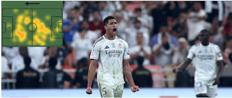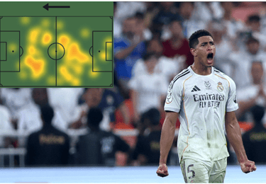 Ο πρώτος είναι ο Τζουντ Μπέλινγχαμ. Μπορεί να μην σκόραρε ή να μην έδωσε ασίστ, όμως ήταν καθοριστικός σε όλο το παιχνίδι. Το heat map του το αποδεικνύει, όπως και οι αριθμοί του: 36/42 πάσες (86% επιτυχία), 4/5 μακρινές μπαλιές και μία key pass. Ο Μπέλινγχαμ αποτέλεσε κομβικό παίκτη στη συνολική λειτουργία της Ρεάλ.