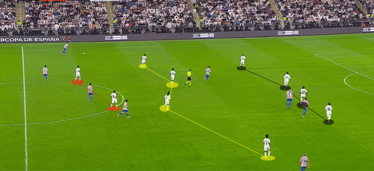 Αμυντικά, η Ρεάλ επέλεξε medium block, χωρίς υψηλή πίεση. Περίμενε την Ατλέτικο στο μεσαίο τρίτο, έκλεισε τον άξονα και την οδήγησε στα πλάγια, κάτι που αποτυπώνεται στις 24 προσπάθειες για σέντρα των «ροχιμπλάνκος». Σε φάση άμυνας, η Ρεάλ παρατάχθηκε σε 4-4-2, με κοντινές γραμμές και σωστές καλύψεις από τα εξτρέμ. Παρ’ όλα αυτά, υπήρξαν αρκετά αβίαστα λάθη, τα οποία δεν κόστισαν, αλλά έφεραν σε δύσκολη θέση τον Κουρτουά, που για ακόμη ένα παιχνίδι δήλωσε «παρών» στα κρίσιμα.